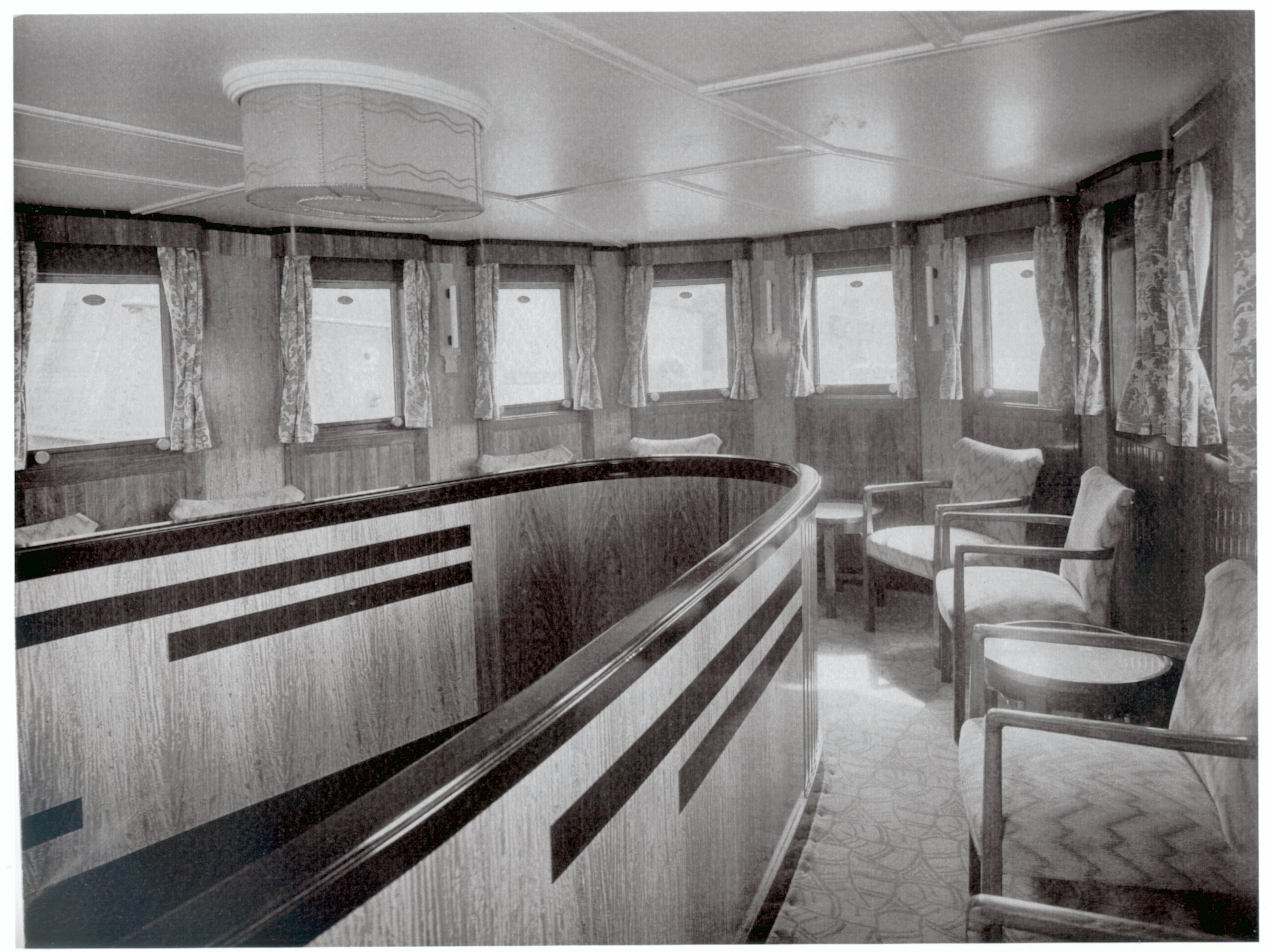 Her technical upgrade was a straightforward case of making her ‘fit for purpose’. The wheelhouse and bridge were raised and she acquired a new upper deck and two saloons, making her taller and more ‘top heavy’ than the other tugs. The story of the renovation of the interiors, however, is more intriguing. The directors had requested a ‘roomy and artistic effect’ and local companies were invited to come up with designs for the remodelling.